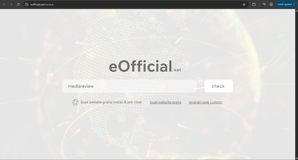 proses lanjut ketik nama akun official yang ingin di jadikan esensi dari website kreator semisal "mediareview" seperti yang ada pada gambar di atas, setelahya tekan tombol check yang berada di samping kanan dari kolom input nama, setelah itu sistem akan melakukan validasi atas ketersediaan nama tersebut apakah sudah di gunakan oleh pengguna lain atau belum di gunakan, apa bila belum di gunakan maka akan muncul keterangan " nama tersedia untuk digunakan, lanjut buat atau cari nama lain " apa bila sudah memutuska menggunakan nama "mediareview" maka tekan tombol buat yang berada di samping kanan dari kolom keterangan input, gambar dapat di lihat di bawah