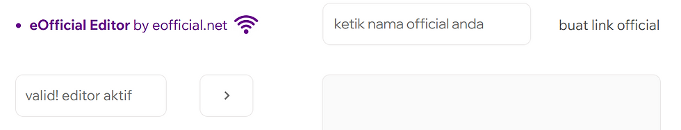 menu di samping kanan dan proses pembaruan informasi ada di samping kiri, setiap menekan tombol menu maka akan meng-aktifkan panel update sesuai fungsi menu tersebut di samping kiri, sebagai contoh apa bila menekan tombol disclaimer maka akan muncul kolom input untuk membuat disclaimer yang akan tampil di halaman publik dari website kreator yang di buat, setiap kali ingin melakukan pembaruan informasi maka di perlukan input kode aktivasi editor yang berapa di samping kiri bagian atas, kode aktivasi editor berfungsi untuk meng-aktif kan tombol update atau pembaruan informasi atas perubahan yang dibuat pemilik akun website kreator. tombol pembaruan informasi secara default akan non-aktif dan hanya akan aktif apa bila kode aktivasi editor sudah valid. input kode aktivasi editor di kolom nya dan tekan tombol validasi yang berbentuk anak panah yang menghadap ke kanan yang berapa tepat di samping kanan kolom input kode aktivasi editor, berikut gambar nya, perhatikan sebelah kiri di bawah eOfficial Editor by eofficial.net ( pastikan signal sudah muncul dan berwana ungu )